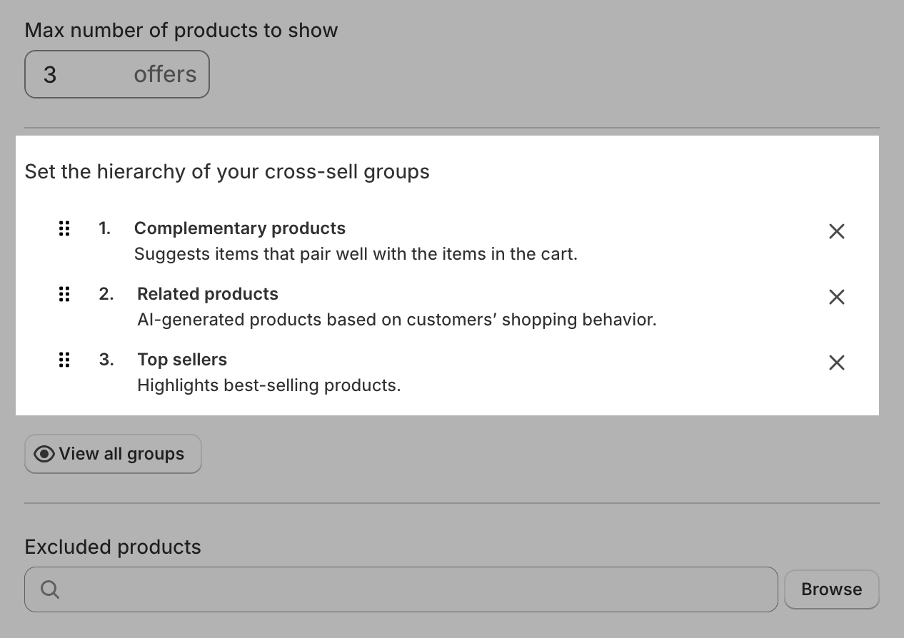 Adjust hierarchy: Set the priority of offer groups (e.g., Complementary Products first).